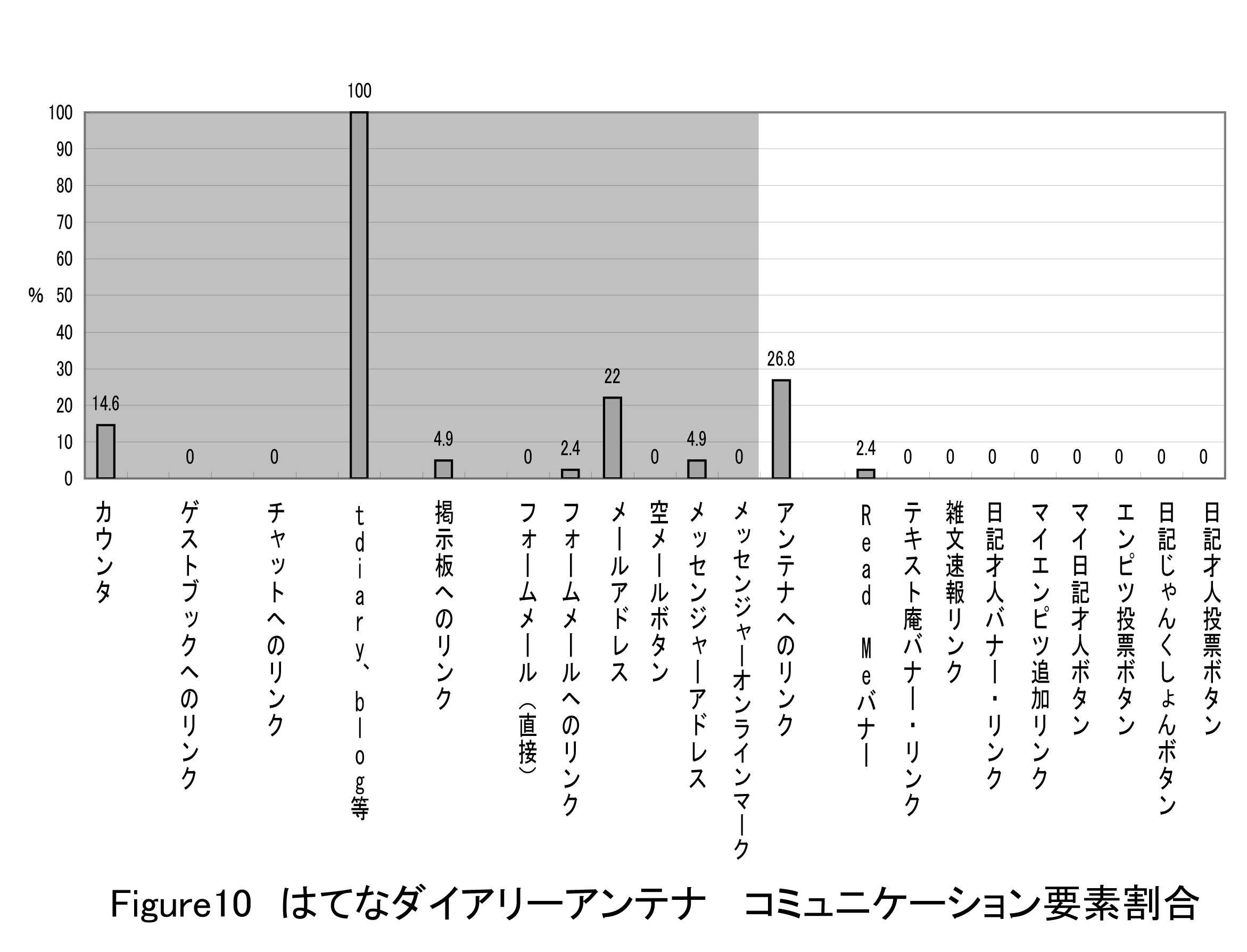はてなダイアリーアンテナ(ウェブログ関係アンテナ)でサンプリングしたウェブ日記中の各コミュニケーション要素が占める割合はFigure10のようになる。