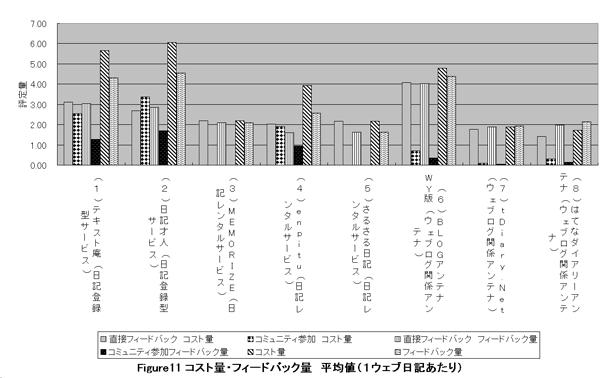 日記登録型サービスに属する(1)テキスト庵、(2)日記才人に関しては、コスト量は他に比べて多くかけていることがわかる。これはわざわざ日記登録サービスに更新報告をする手間をかけるウェブ日記作者の集団であることに起因すると思われる。