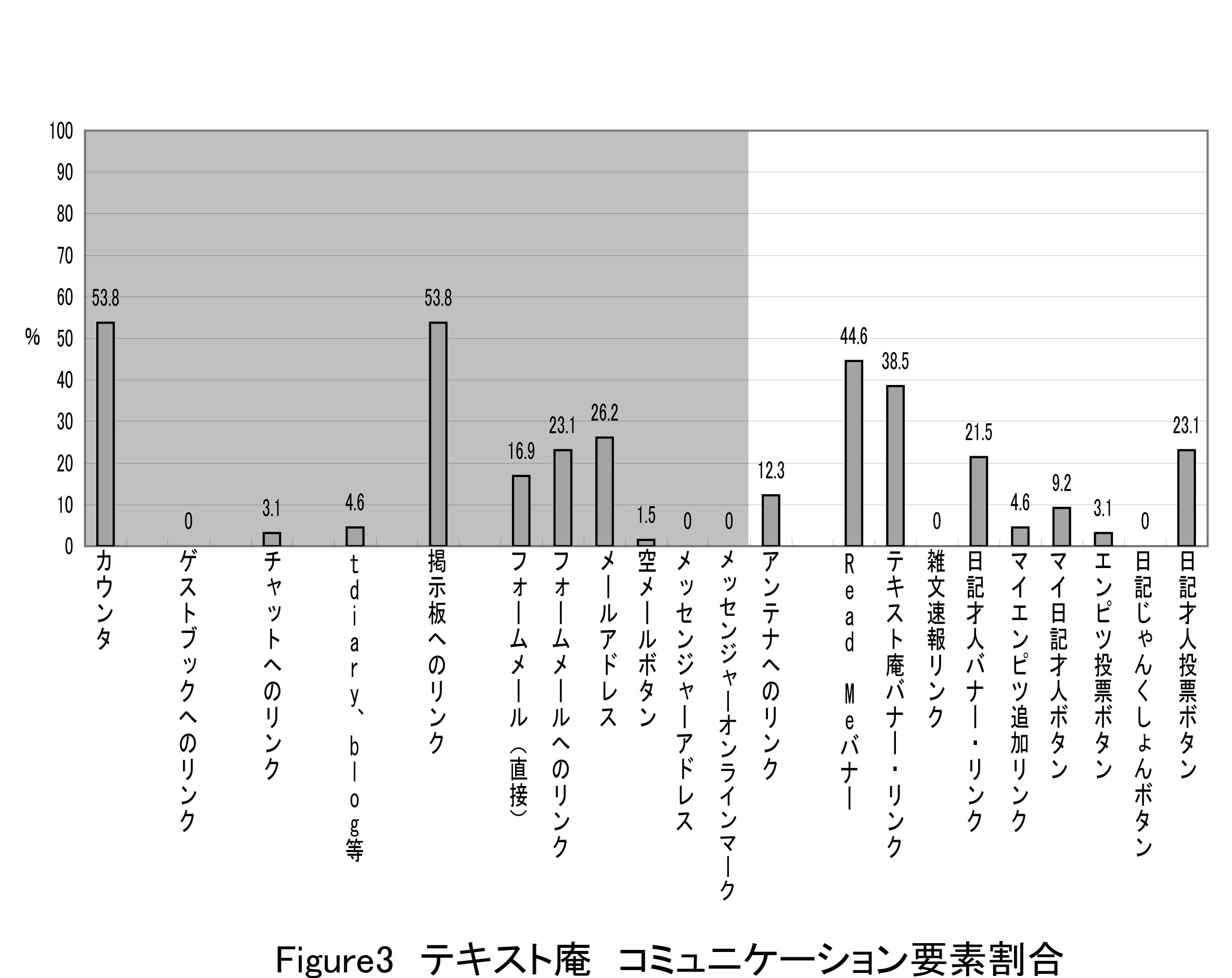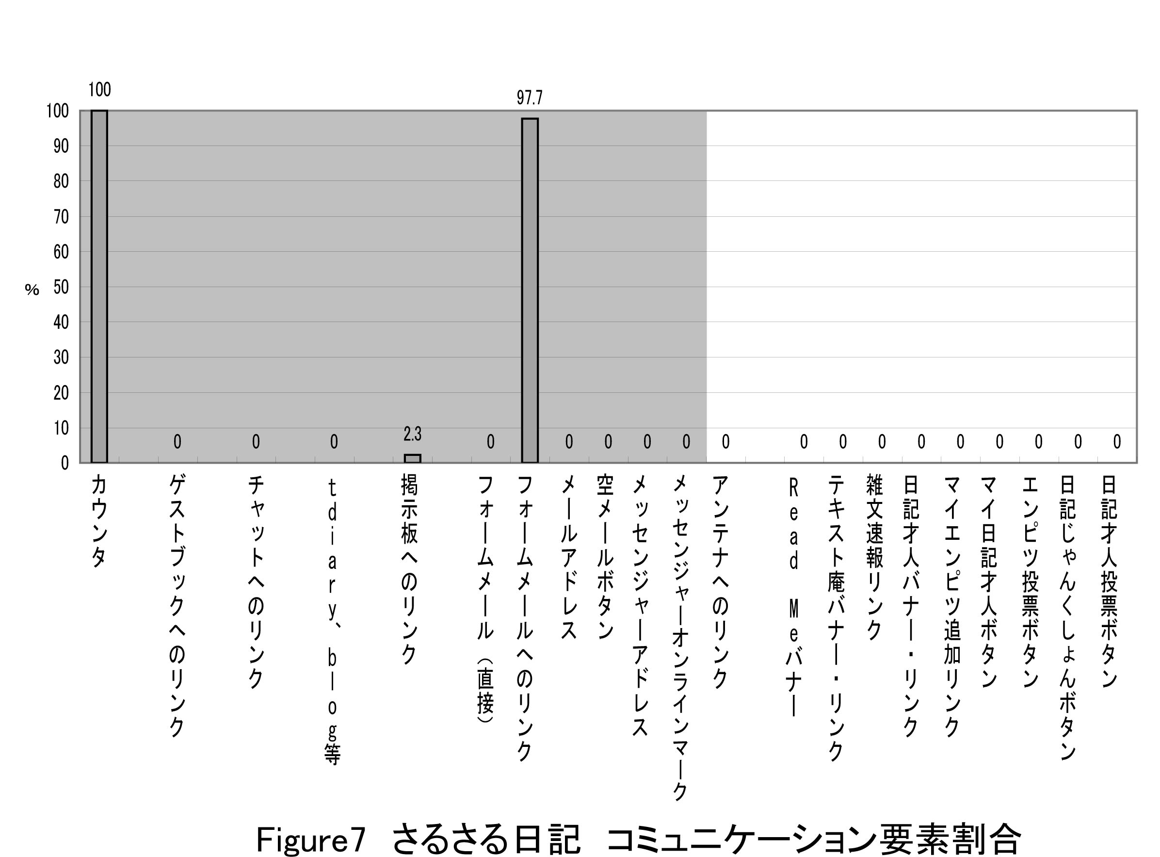 というのは、コミュニケーション要素の中でカウンタが一番高い割合で存在し読者の存在確認を求めており、それに飽きたらず、メールアドレスを公開したり、フォームメールを設置したり、掲示板を設置する、また、コメント機能を持つウェブログとして日記を設置するなど、なんらかの形で直接的フィードバックを求めている日記が多くの割合を占めてくるからである(直接的フィードバックを求める要素が全くない日記の方が少数派となっている)。また、コスト量からも直接的フィードバックを求めているさまがわかってきている。その結果を見るに、ウェブ日記作者が読者とのコミュニケーションを希求している様がよく感じ取られるのである。
