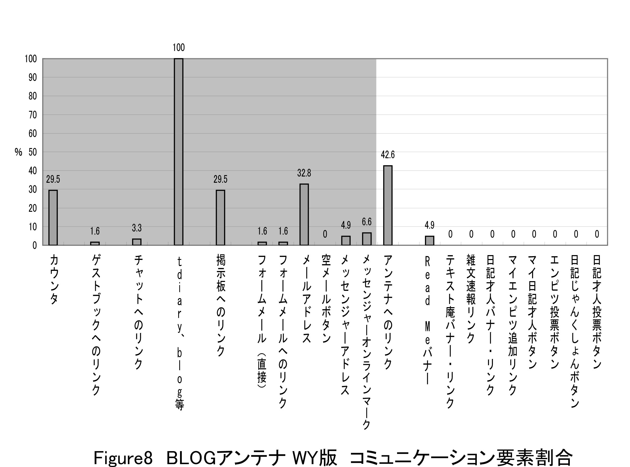 BLOGアンテナ WY版(ウェブログ関係アンテナ)でサンプリングしたウェブ日記中の各コミュニケーション要素が占める割合はFigure8のようになる。