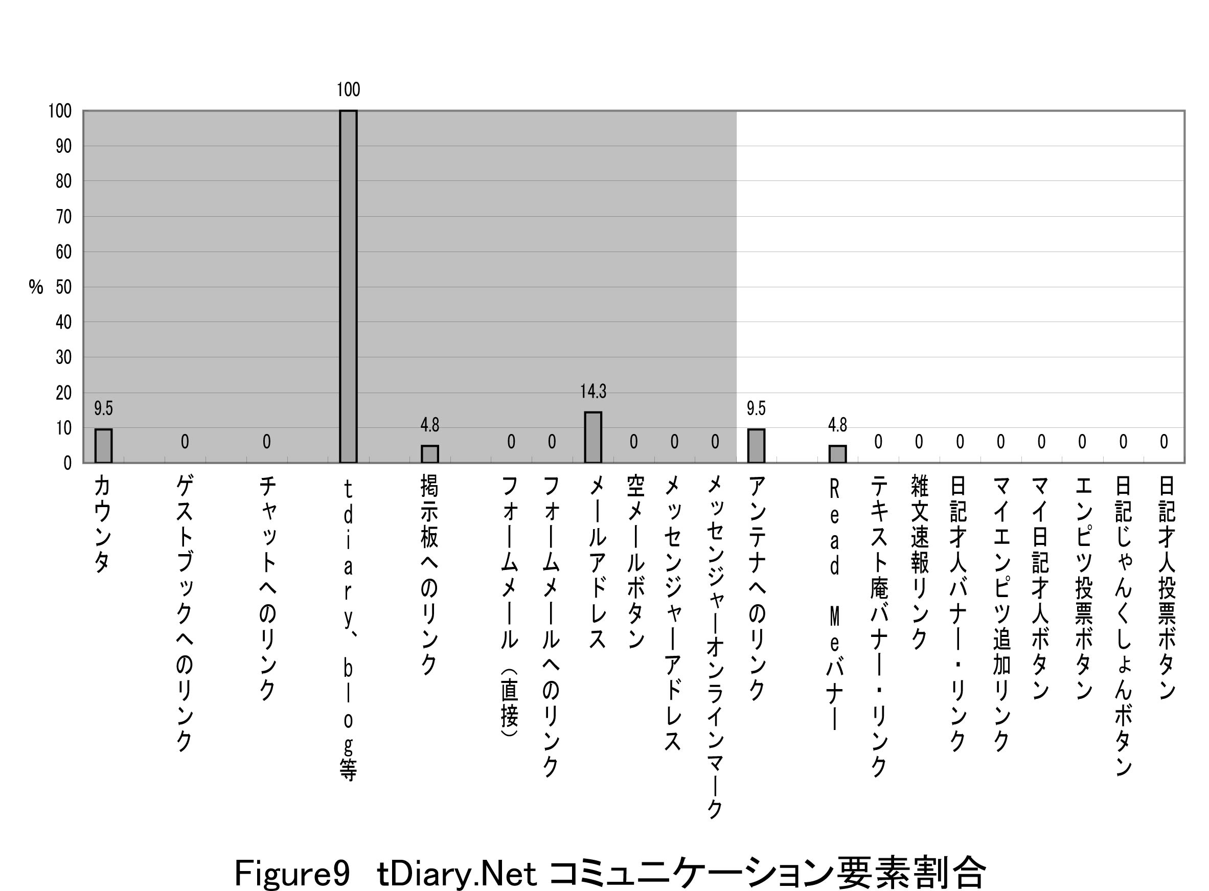 tDiary.Net(ウェブログ関係アンテナ)でサンプリングしたウェブ日記中の各コミュニケーション要素が占める割合はFigure9のようになる。